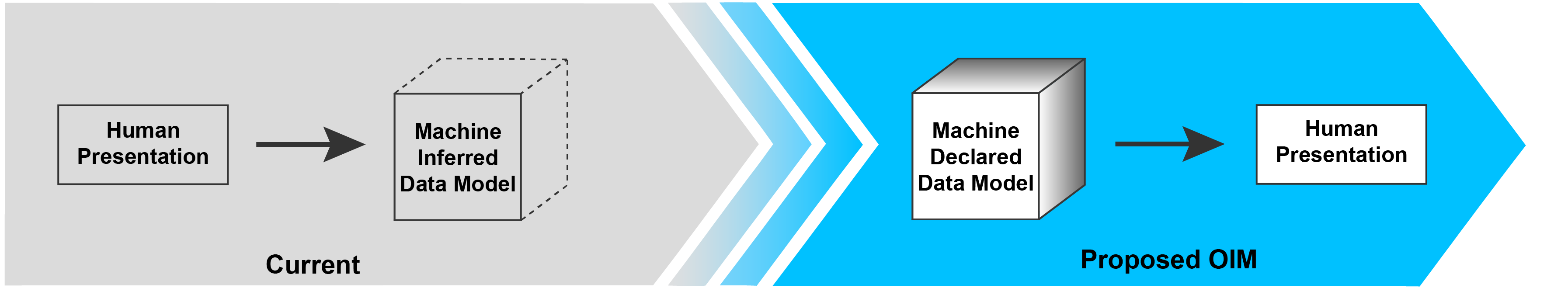 For example, in the present system, the data model is inferred from the presentation. What we are proposing with the Open Information Model (OIM) is a cube model that declaratively defines the structure of the data.
